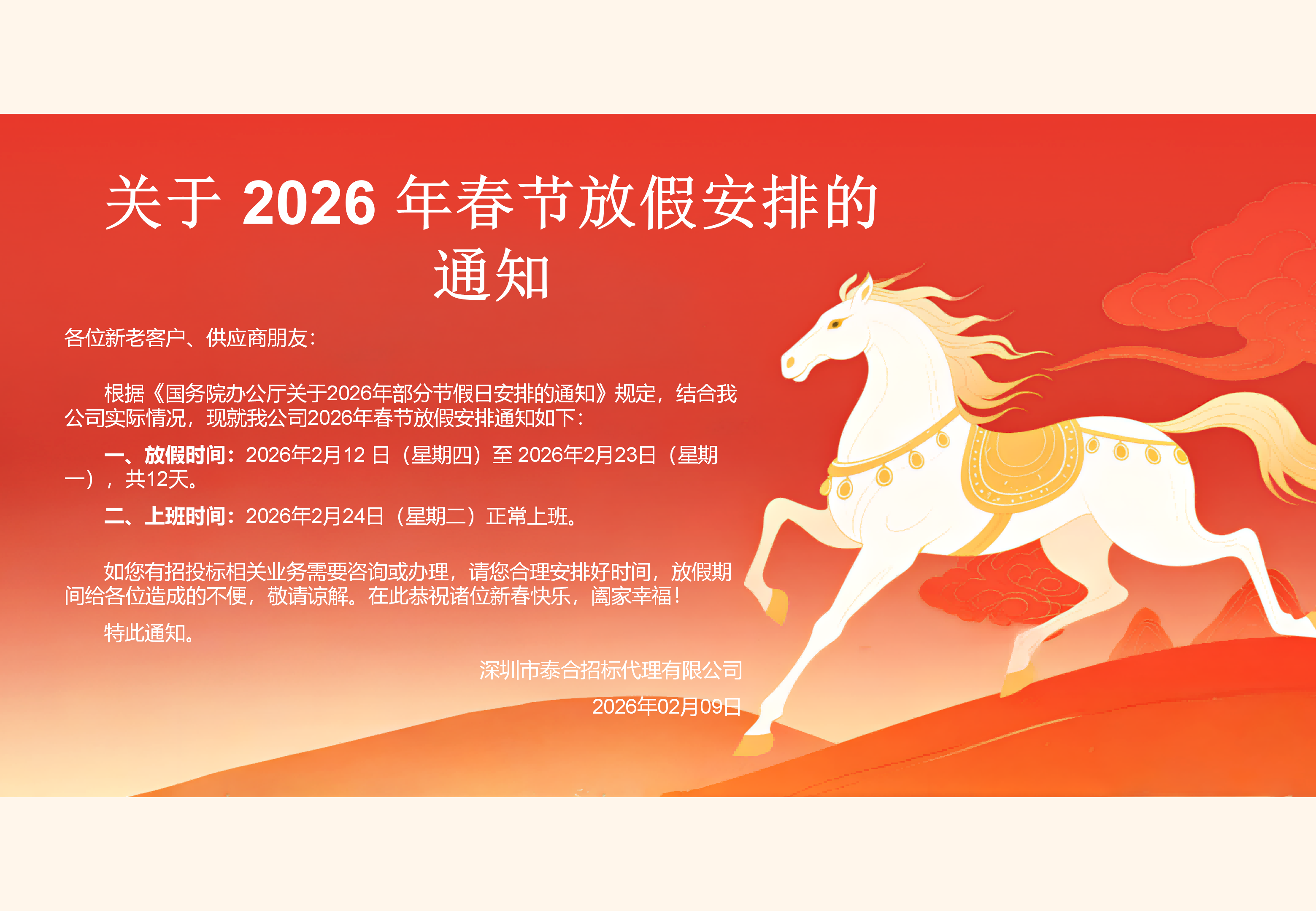 关于 2026 年春节放假安排的通知